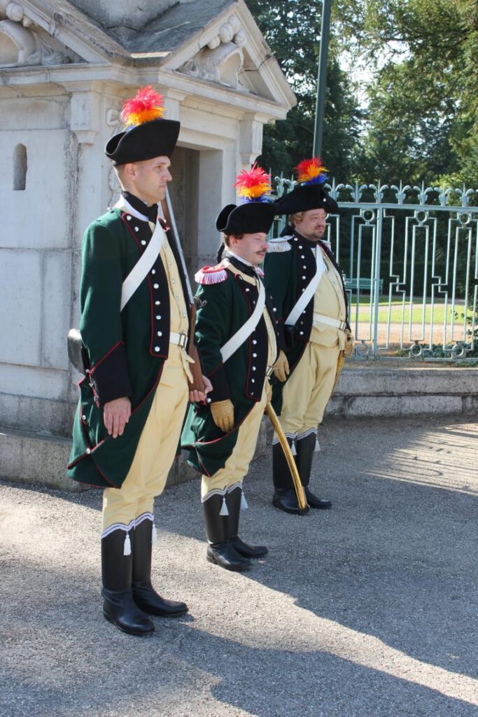 Unsere Arbeit folgt den historischen Reglements für Kavallerie und Infanterie von 1778. Auch der historische Ladedrill für Karabiner und Pistolen wird präzise dargestellt. Besonders der Schwarzpulver-Ehrensalut mit Vorderlader-Waffen ist ein wichtiger Bestandteil unserer Darstellungen.